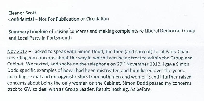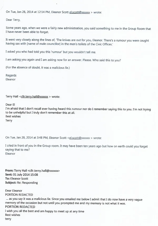 The (then) councillor who told me of the 'rumour' was Terry Hall. I vividly recall - and I did subsequently write the details down - that we were alone together in the Lib Dem Group Room at the Portsmouth City Council civic offices, fairly early in our tenure at the council (so during 2002-03). She was collecting post and putting it in her bag. She had longer hair in those days. I was wearing a dark trouser suit. Terry said something identical or very close to: 'The knives are out for you, Eleanor. There's a rumour you were caught having sex with [name of male cllr] in the men's toilets of the civic offices'.