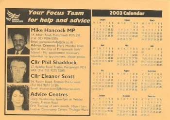 Lib Dem ward calendar, delivered to lucky Fratton residents December - January 2002-03